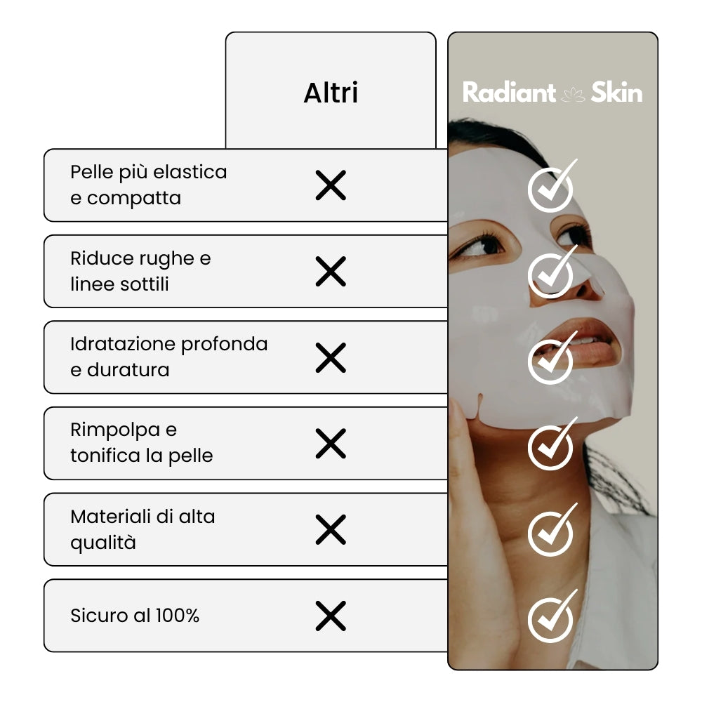 La maschera rilascia collagene e principi attivi direttamente sulla pelle, favorendo l’idratazione e il sostegno delle fibre cutanee.